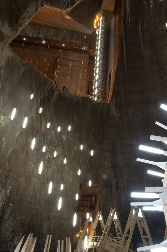 Mina Rudolf (preluare www.Ropedia.ro) are o forma de sala trapezoidala numita in termeni tehnici abataj in talpa. Aceasta a fost inceputa in anul 1867 si are o latime de circa 50 m, o lungime a vetrei (talpa abatajului) de 80 m iar adancimea este de 40 de m. Scarile coboara de a lungul a 13 etaje fiecare avand marcat anul in care a fost sapat. Datorita infiltratiilor pe peretele nordic s-au format stalactite de sare cu o viteza de crestere de 2 cm/an. Ca urmare a lucrarilor din ultimii ani Mina Rudolf a fost dotata cu o serie de elemente noi care sunt destinate turistilor: sala de concerte, teren de sport, gondola, minigolf, bowling. A fost montat si un lift pentru a usura accesul in mina.Si cu liftul ala am coborat...